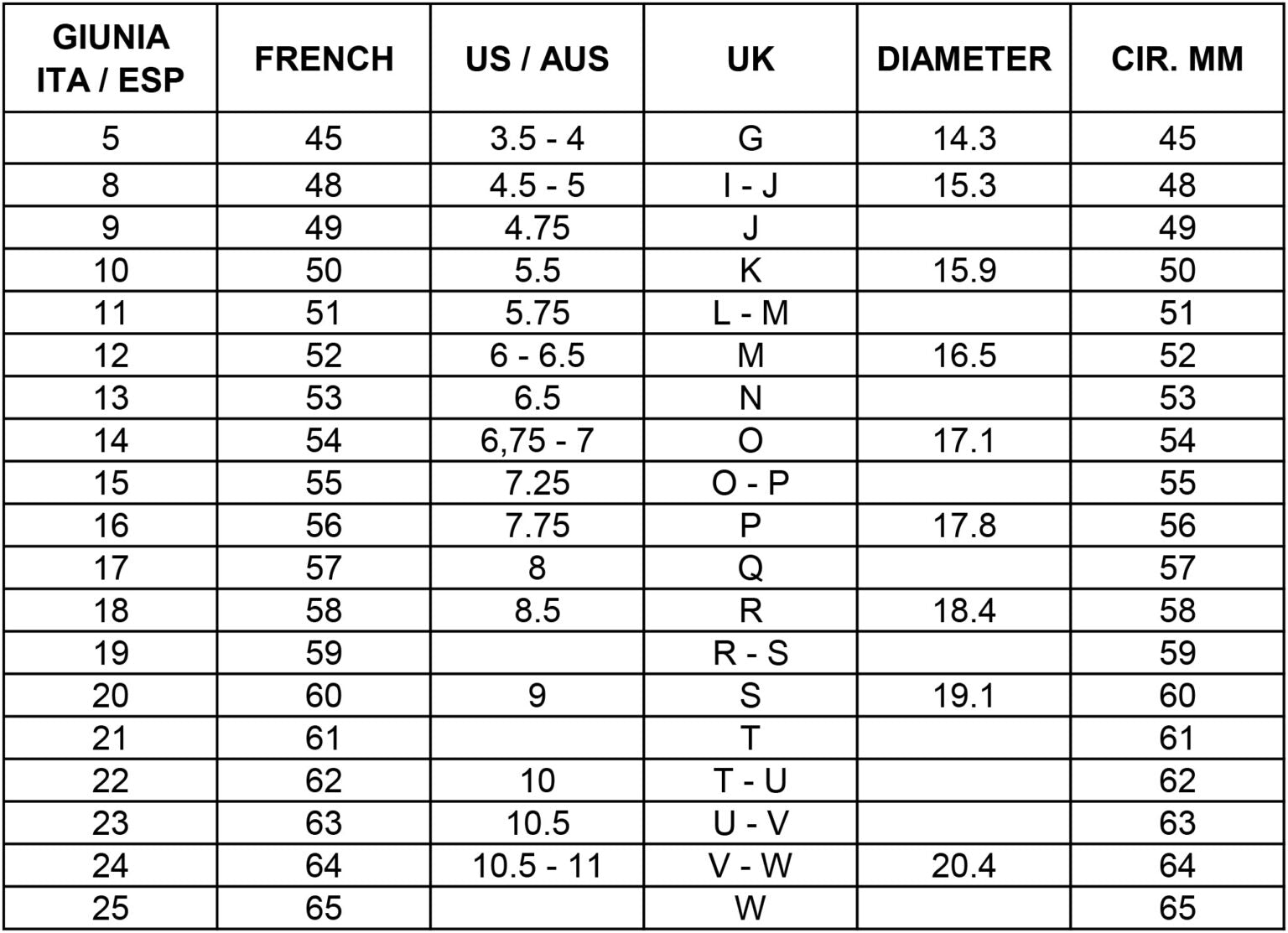 We’ve included below a ring size and conversion chart to help you find the perfect fit. Our rings are crafted in Italian sizes.