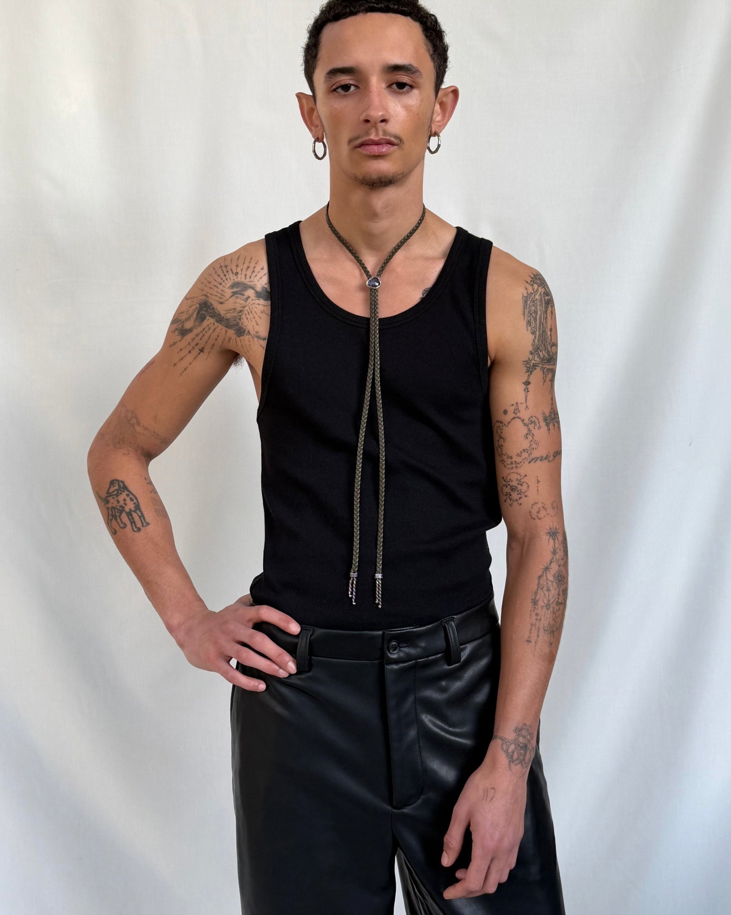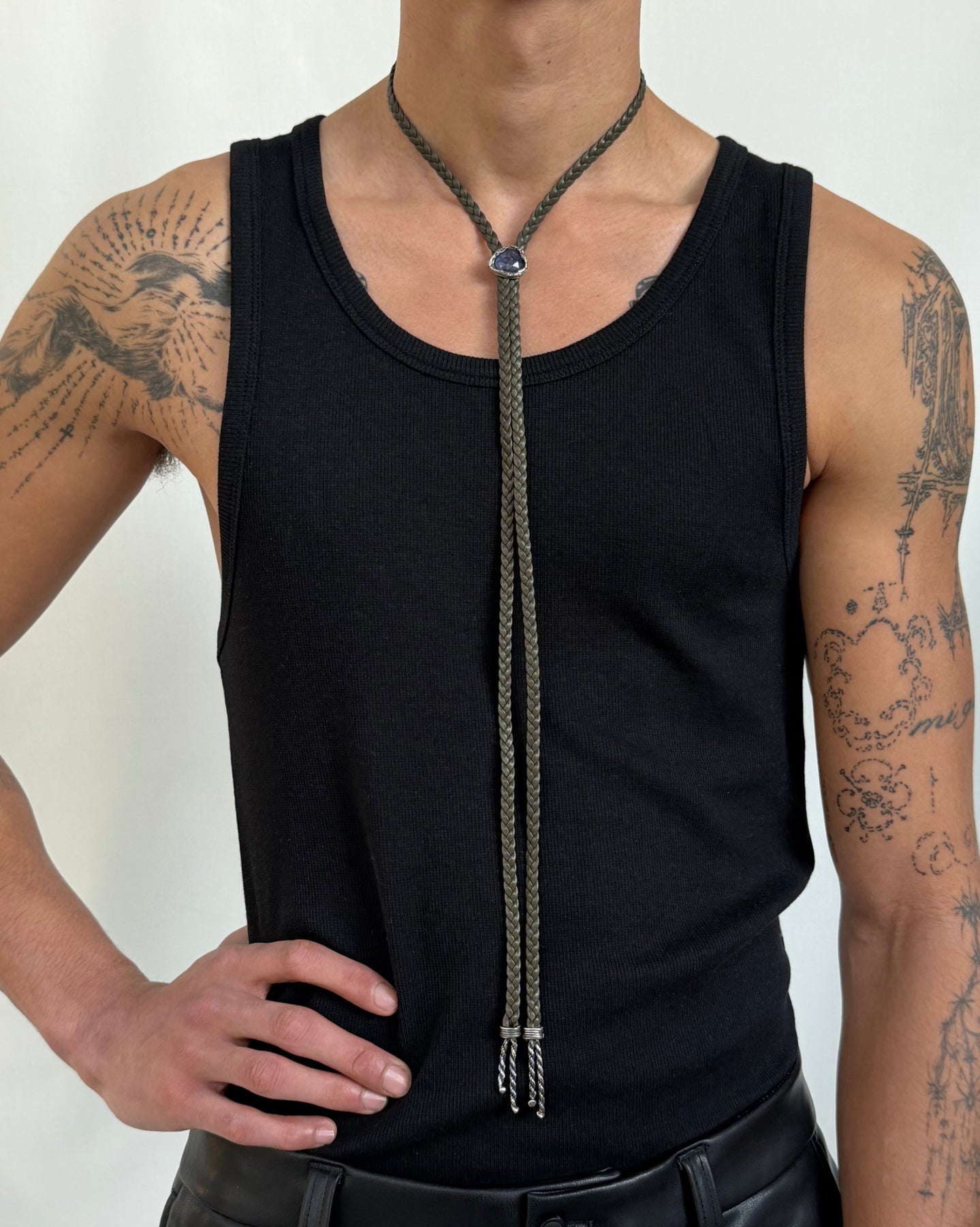 This versatile leather string for choker or belt is an essential accessory to any jewellery collection. Crafted by hand in Italy, braided from upcycled leather and finished with twisted chain ends. It's a multi-use pieces that adds an extra touch to your outfit, whether styled casually or as a statement detail.