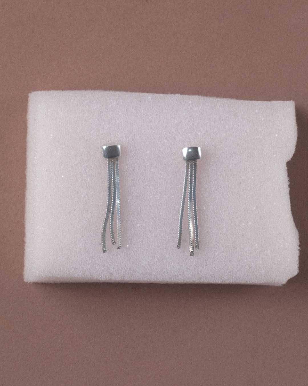 A pair of vintage sterling silver earrings with a geometric stud and fine chain drops. Three delicate chains fall freely from each stud, creating soft movement and a subtle shimmering effect when worn.